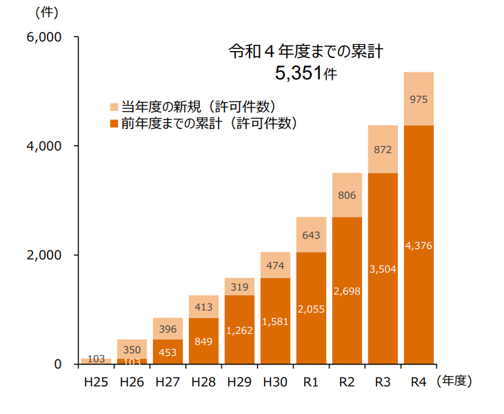 近年、ソーラーシェアリングを導入する農地が増加しており、農林水産省のデータによれば、2013年度に100件程度だったソーラーシェアリングの導入数は、2022年度には5,000件を超えるまでに成長しています。