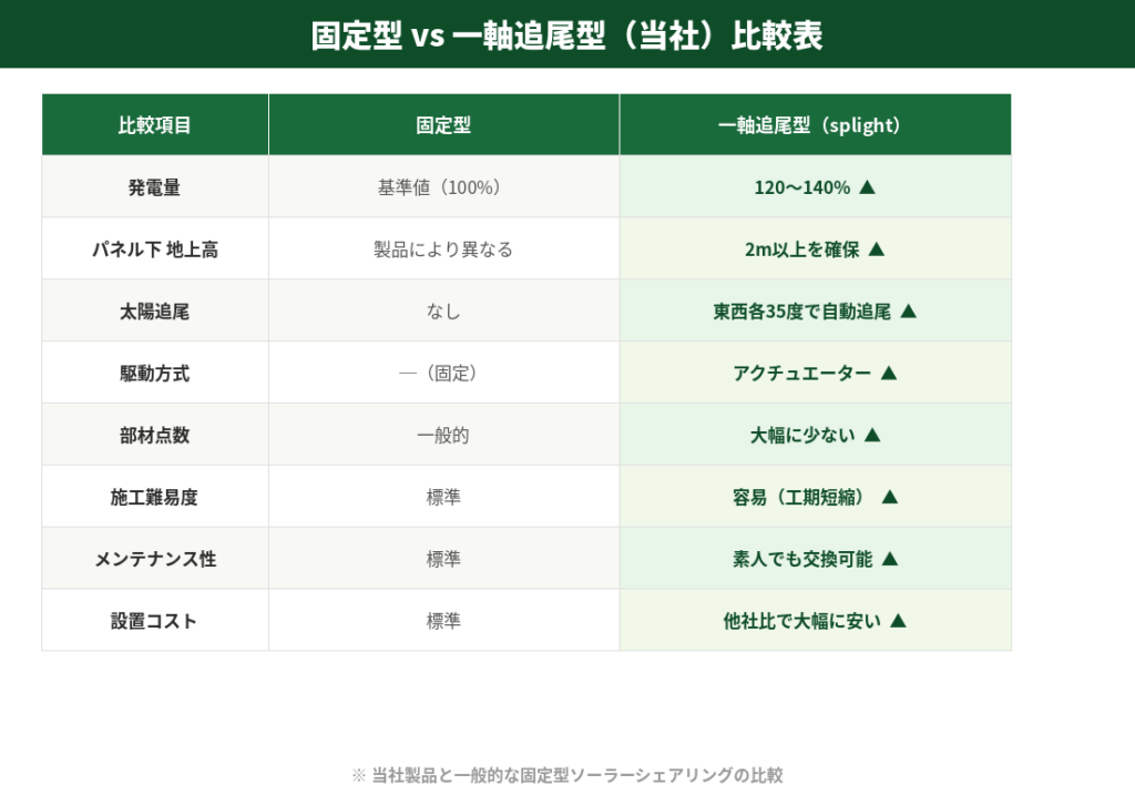 固定型のソーラーシェアリングと比較した場合、当社の一軸追尾型には上記のような違いがあります。
