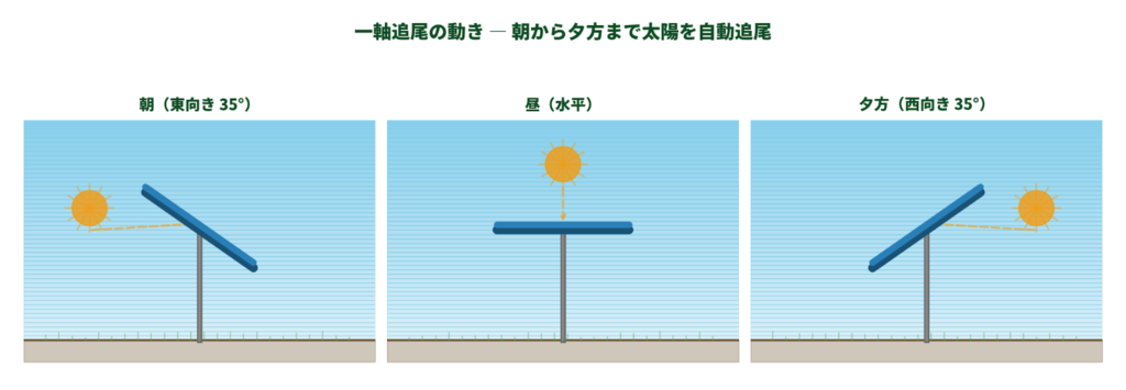 当社の一軸追尾型は、東西それぞれ35度の範囲でパネルが太陽を自動追尾します。この仕組みにより、固定型と比べて約1.2倍〜1.4倍の発電量増加が期待できます。