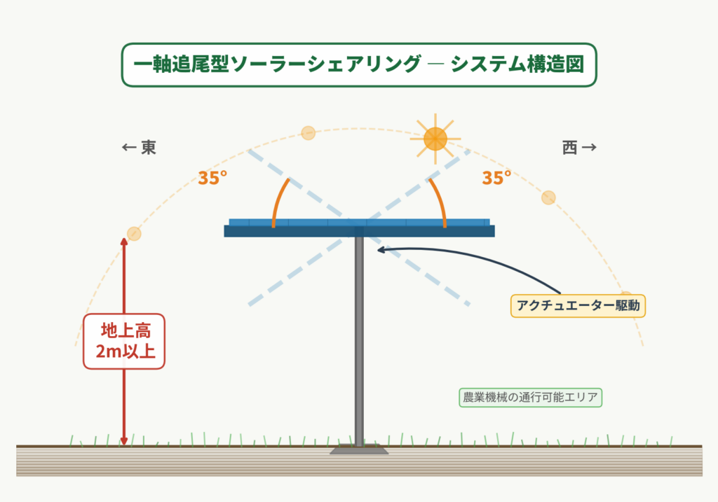 この記事では、一軸追尾型ソーラーシェアリングの仕組みや固定型との違い、当社システムの特徴について、初心者の方にも分かりやすく解説します。
