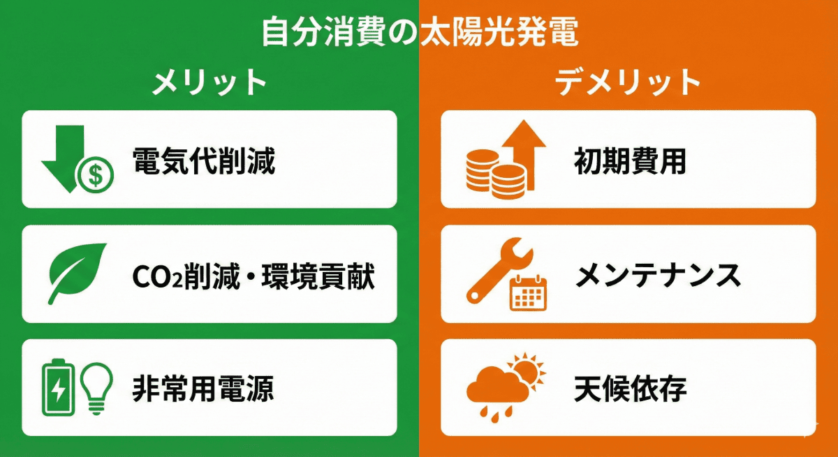 自家消費型太陽光発電の導入を検討する上で重要な、メリットとデメリットをご紹介します。
