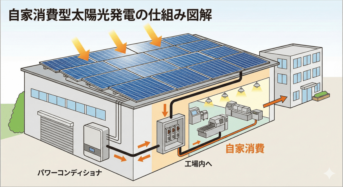 しかし、自家消費型太陽光発電は、その名の通り「発電した電気を自社の設備や工場でそのまま使う」仕組みです。